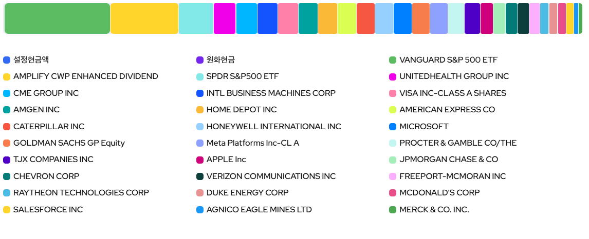 Kodex 미국배당커버드콜액티브를 구성하고 있는 종목들은 위와 같습니다. 다양한 산업에 분산투자되어있으며, JEPI와 S&P 500 ETF를 가장 비중있께 담고 있습니다. 하지만 이름에서 알 수 있듯이 "액티브" 종목이라 매니저가 시장 상황에 따라 변동을 줄 수 있습니다.